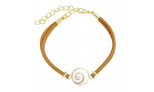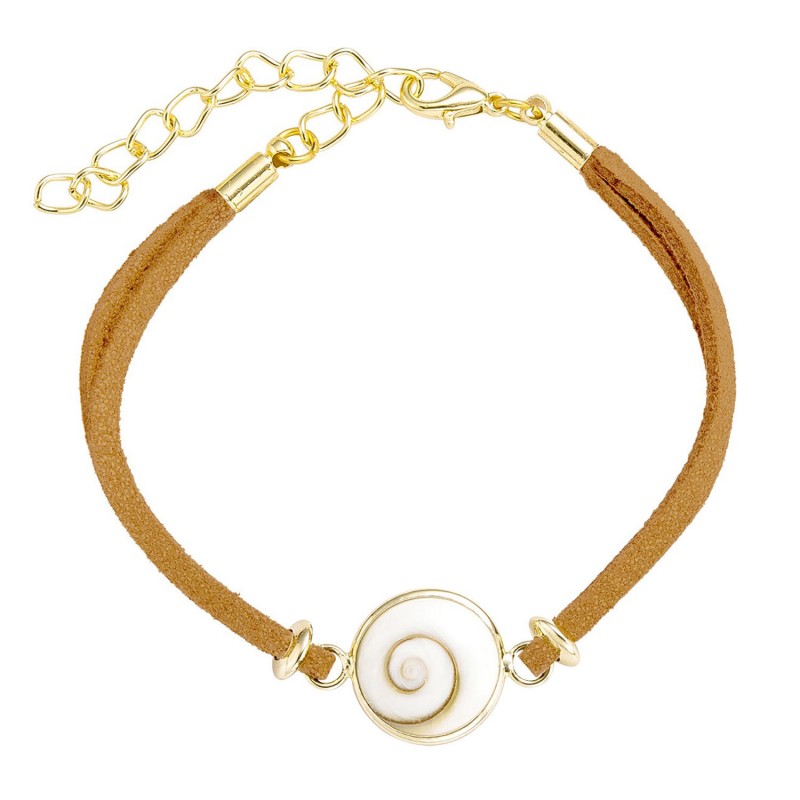 Ce bracelet associe la douceur d’une suédine couleur camel à la symbolique protectrice de l’Œil de Sainte-Lucie, véritable coquillage naturel reconnu pour attirer chance et protection contre le mauvais œil.