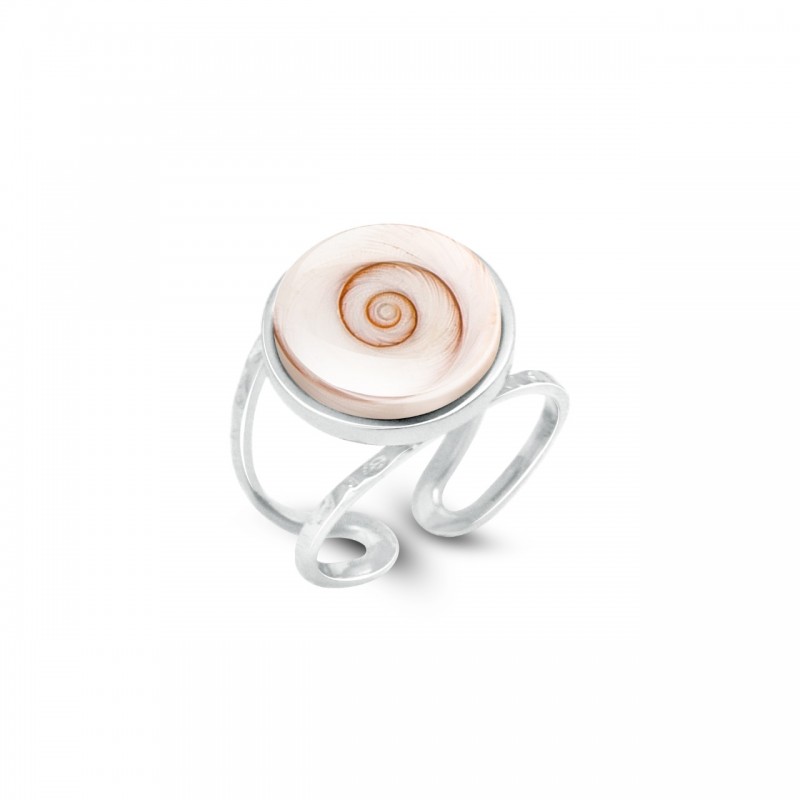 La monture en argent, au design moderne et raffiné, met parfaitement en valeur la beauté naturelle du coquillage. Chaque bague est une pièce unique, puisque chaque œil de Sainte-Lucie présente des nuances et spirales différentes.