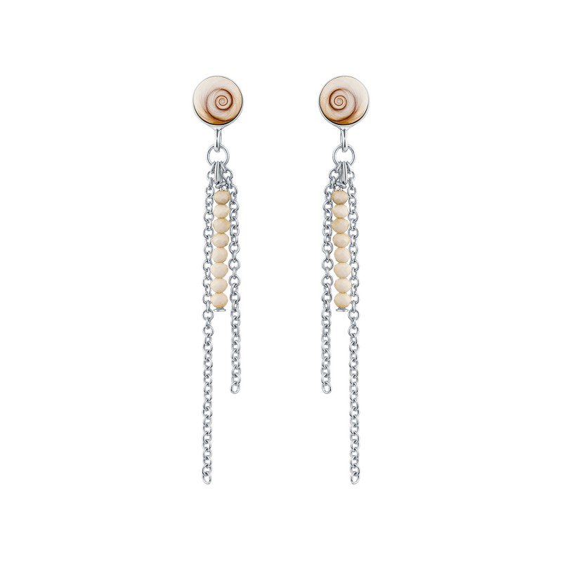Leur design délicat associe un œil de Sainte-Lucie méditerranéen, coquillage porte-bonheur connu pour sa protection et son énergie positive, à une cascade de chaînettes argentées ponctuées de pierres howlite pour une touche de douceur et d’élégance.