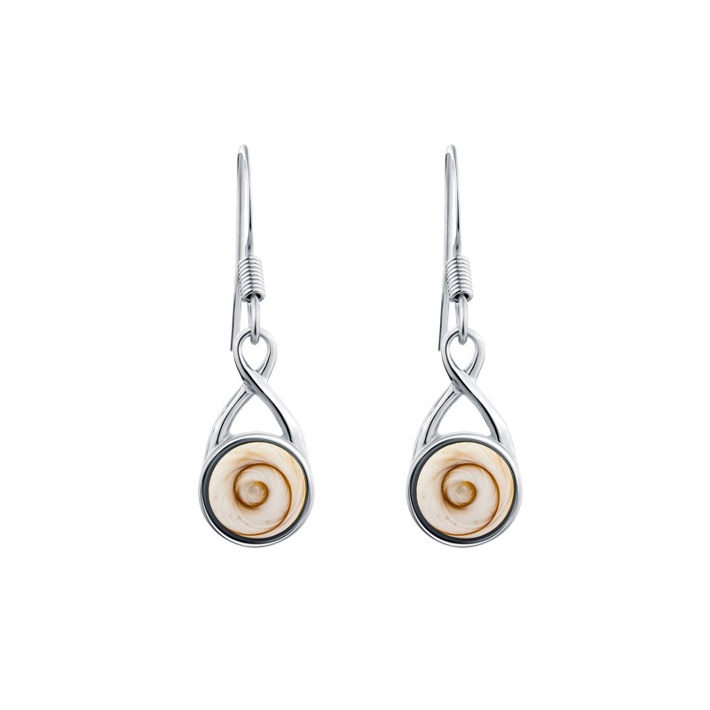 Ces boucles d’oreilles pendantes en argent 925 mettent en valeur l’authenticité de l’Œil de Sainte-Lucie corse, coquillage emblématique de la Méditerranée.