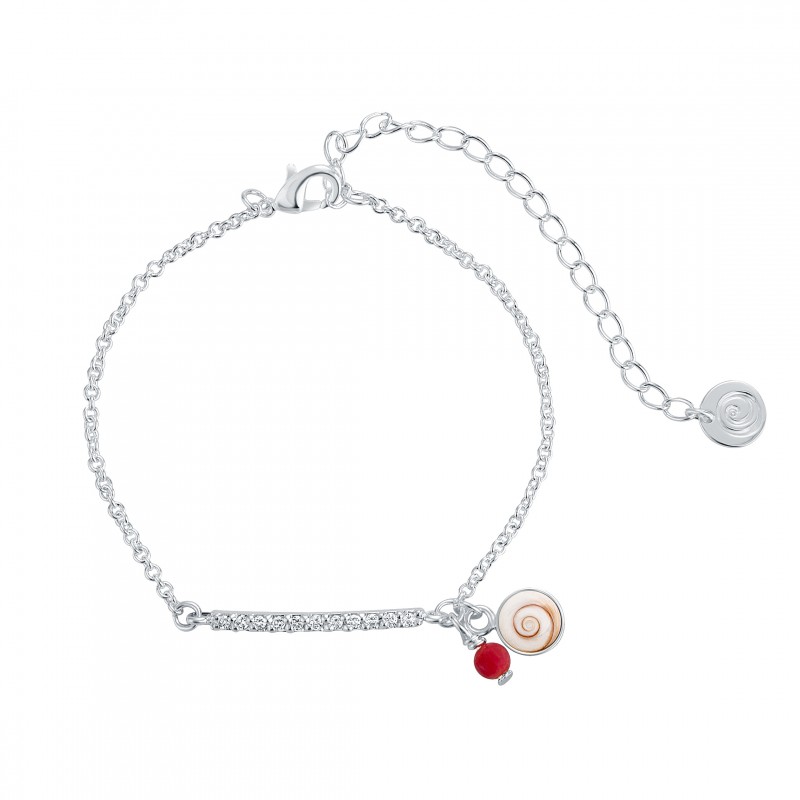 Un bracelet délicat en argent, illuminé d’une barre étincelante et orné d’une perle rouge et d’un véritable Œil de Sainte-Lucie, symbole de chance et de protection.