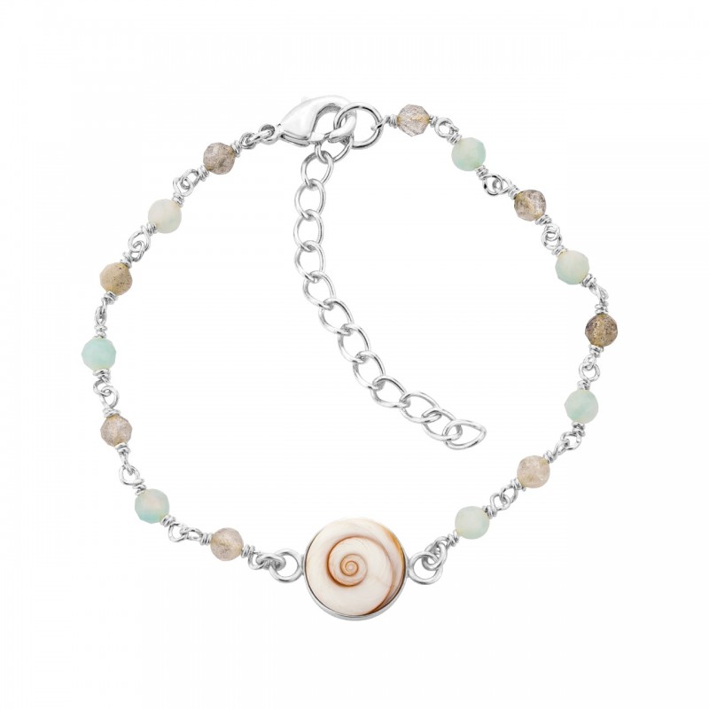 Ce bracelet en argent 925 met en valeur la beauté de l’Œil de Sainte-Lucie méditerranéen, spirale naturelle porte-bonheur, associé à des perles facettées aux nuances douces et organiques.