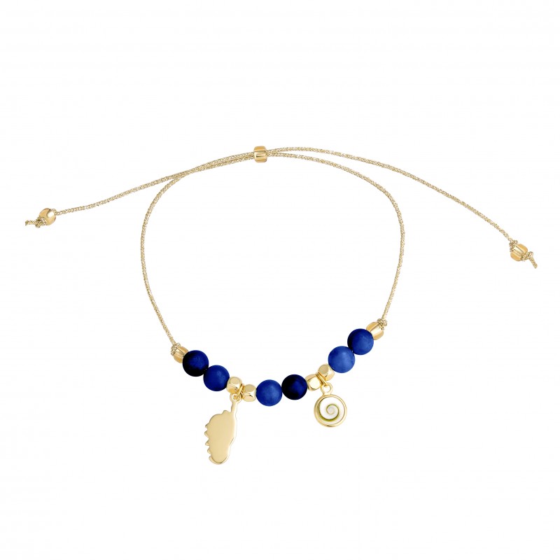 Un bracelet doré lumineux mêlant la profondeur du lapis-lazuli, la protection de l’Œil de Sainte-Lucie et le symbole fort de la Corse.