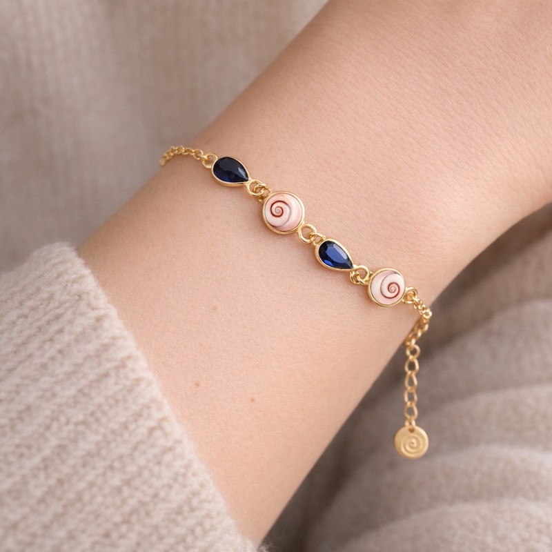 Ce bracelet doré marie la beauté de l’Œil de Sainte-Lucie, coquillage corse porte-bonheur, à l’intensité lumineuse des pierres bleues taillées en gouttes.
