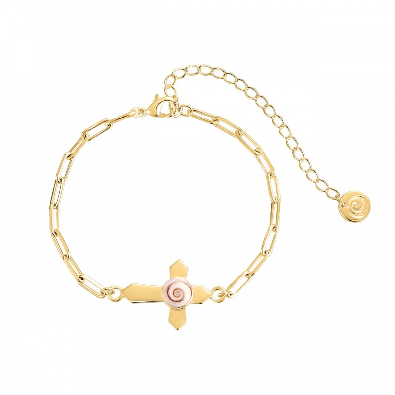 Bracelet doré raffiné composé d’une croix moderne sertie d’un véritable Œil de Sainte-Lucie méditerranéen, monté sur une chaîne à maillons rectangulaires avec extension décorée d’un médaillon spirale. Un bijou lumineux, protecteur et élégant.