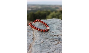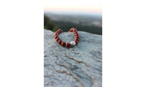 Bracelet en perles de pierre rouge naturelle, sublimé par un véritable Œil de Sainte-Lucie corse. Modèle ajustable, symbole de chance et de protection.
