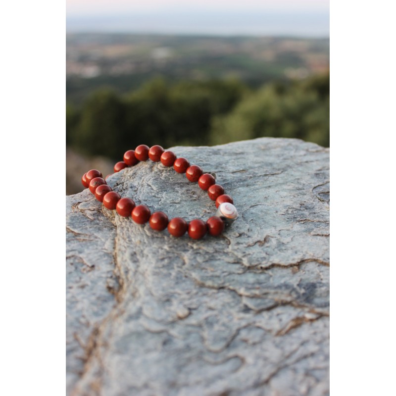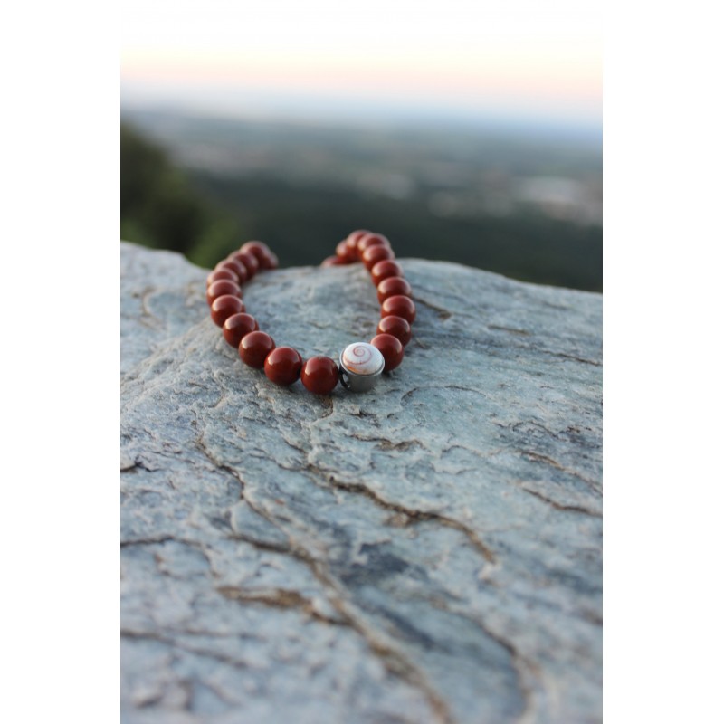 Ce bracelet associe la puissance des pierres rouges naturelles à l’authenticité de l’Œil de Sainte-Lucie, coquillage méditerranéen emblématique de la Corse.