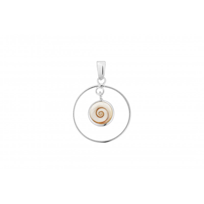 Pendentif en argent 925 composé d’un grand anneau épuré et d’un véritable Œil de Sainte-Lucie délicatement suspendu au centre. Un bijou lumineux, protecteur et élégant.