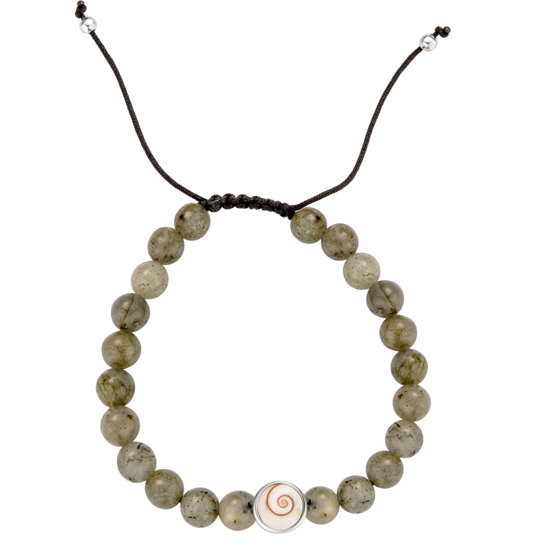 Monté sur un cordon en coton gris, ce bracelet à coulisse s’ajuste en un geste et accompagne naturellement chaque mouvement. Au centre, un véritable œil de Sainte Lucie de Méditerranée attire le regard, rehaussé par la labradorite et ses nuances irisées, entre bleu et vert, comme un horizon qui se transforme selon la lumière. Léger (4 g) et agréable à porter, il se glisse facilement dans le quotidien, seul ou en accumulation.