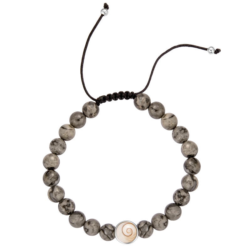 Tout en nuance, ce bracelet coulissant marie la douceur des pierres à l’éclat naturel d’un véritable œil de Sainte-Lucie méditerranéen. Ses tons gris et blanc évoquent une lumière calme, celle qui glisse sur la peau et accompagne les gestes sans jamais les alourdir.