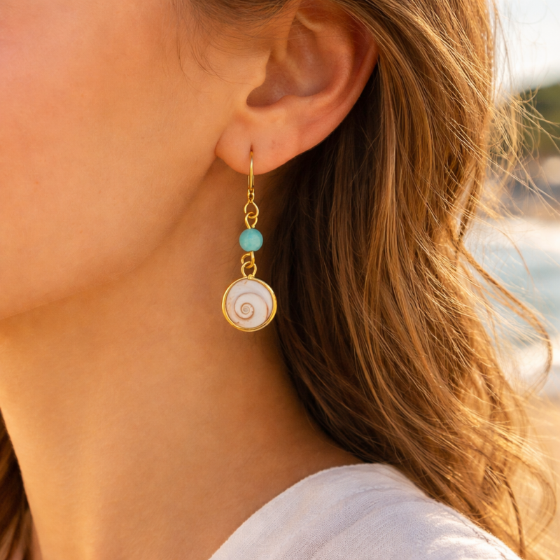Ces boucles d'oreilles ornées d'un œil de sainte Lucie et d'une pierre d'amazonite illuminera votre visage
