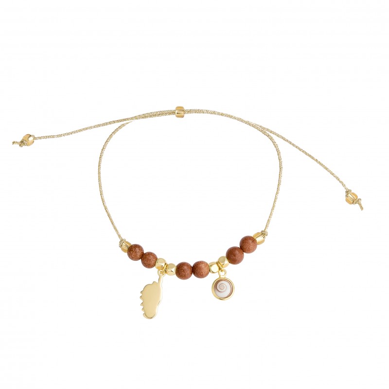 Ce bracelet doré allie élégance et symbolique avec ses perles scintillantes, son œil de Sainte-Lucie porte-bonheur et sa carte de Corse emblématique.