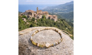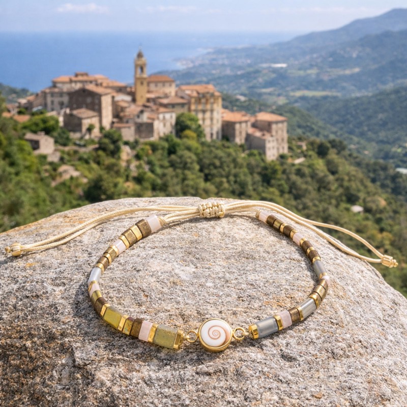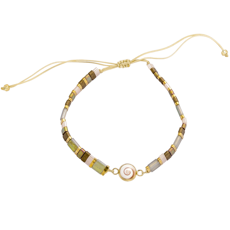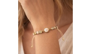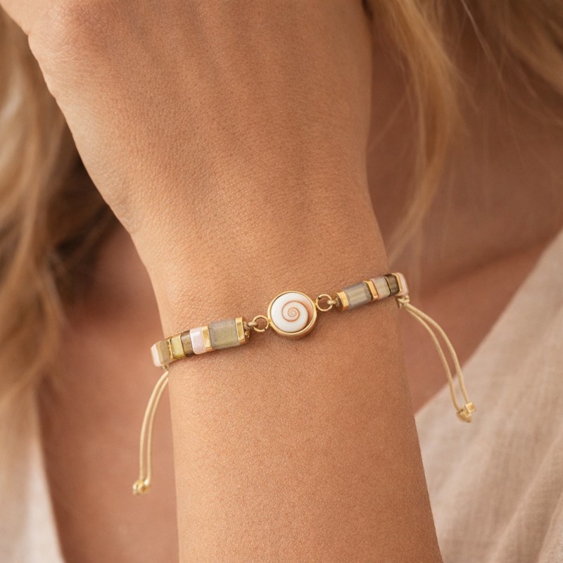 Pensé comme un éclat de lumière au poignet, ce bracelet ajustable en cordon de coton se glisse dans tous les moments du quotidien. Au centre, un véritable Œil de Sainte Lucie (Méditerranée), rehaussé de perles rectangulaires multicolores et de finitions dorées, pour une touche chaude et précieuse sans en faire trop.