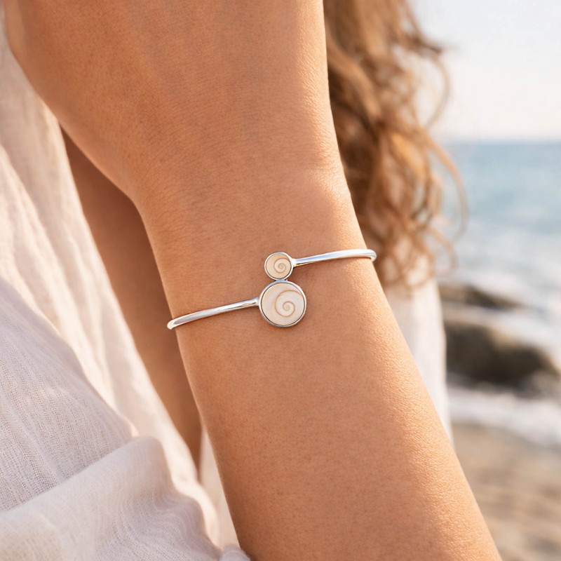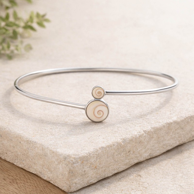Bracelet rigide en Acier plaqué argent Rhodié orné de 2 yeux de sainte Lucie de méditerranée.