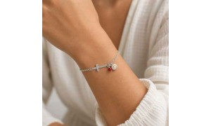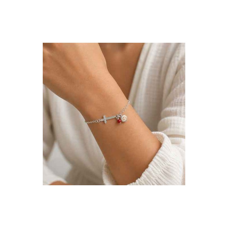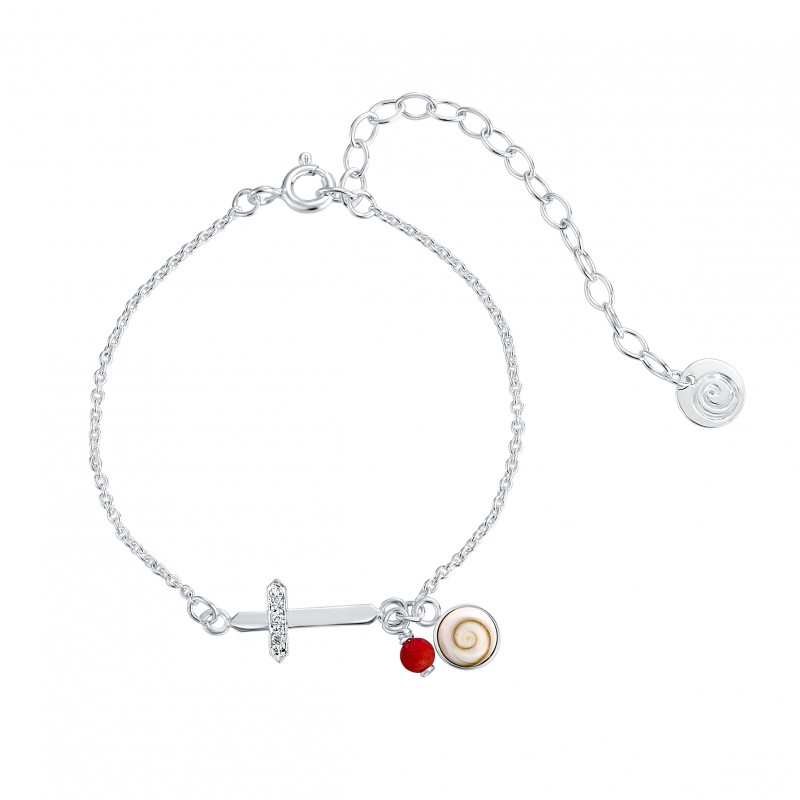 Bracelet en argent 925 orné d'un œil de sainte Lucie du Pacifique, d'un corail rouge de méditerranée et d'une croix.