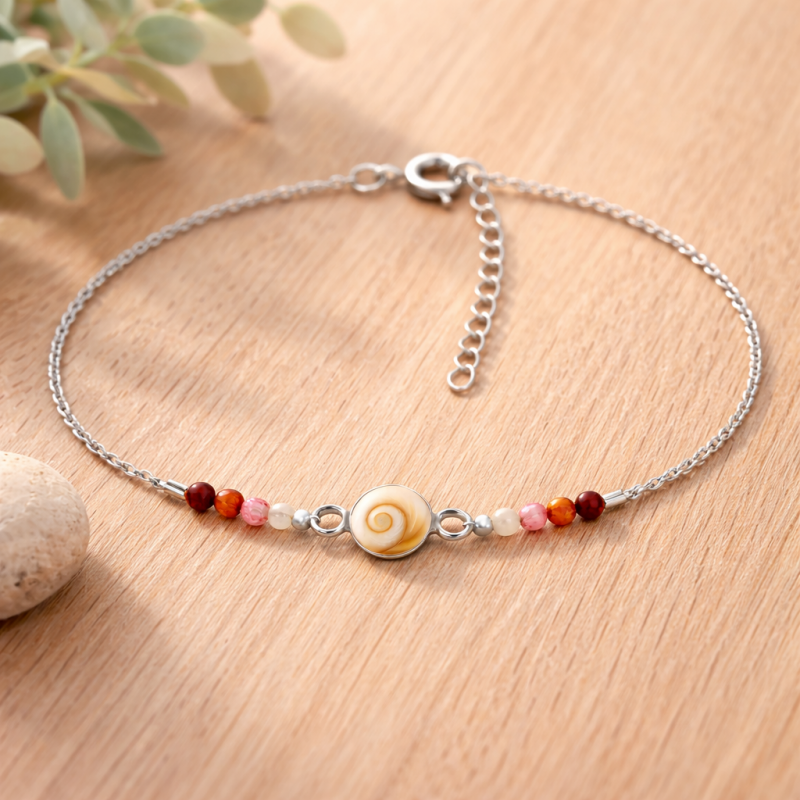 Bracelet en argent 92,5 orné d'un œil de Sainte-Lucie Méditerranéen d'origine garantie et de forme ronde, inséré dans un cabochon, et des perles de couleur. Ce bracelet est également doté d'une chaînette de réglage de 4 cm permettant de l'adapter à la plupart des poignets.