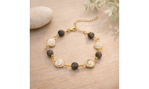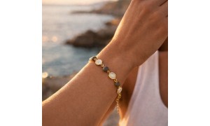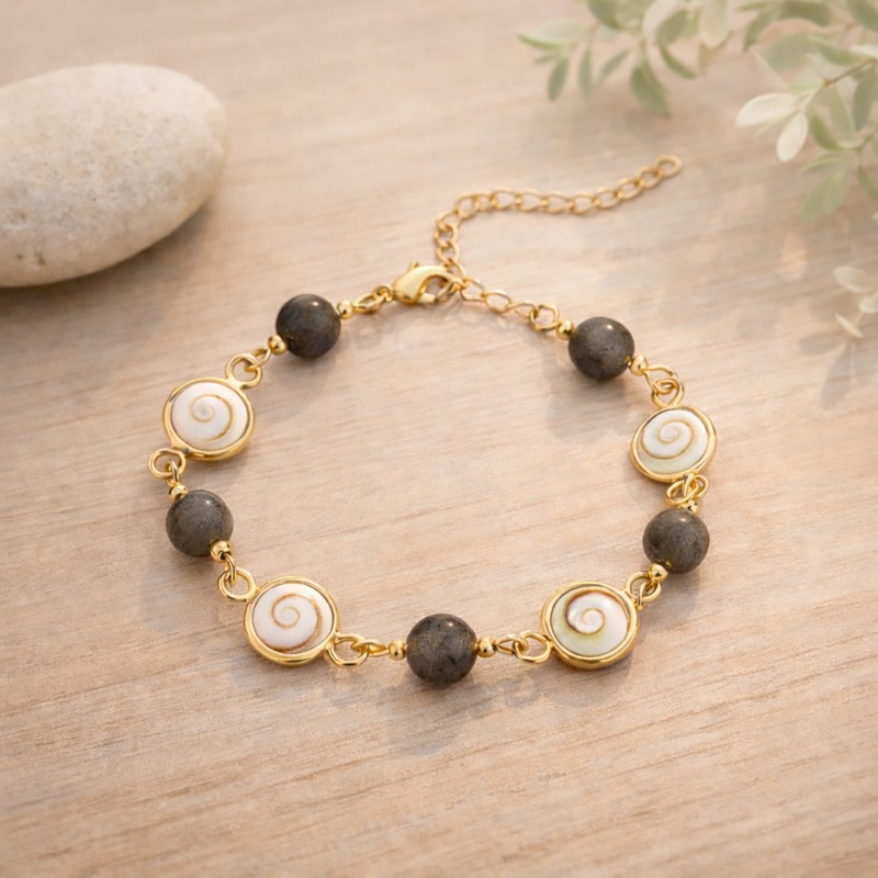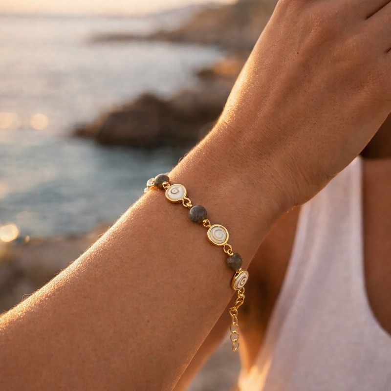 Entre nacre brune et reflets changeants, ce bracelet doré à l’or fin révèle une beauté organique, presque magnétique. Son Œil du Pacifique (œil de Shiva) attire le regard par ses nuances naturelles, tandis que la labradorite apporte cette profondeur grise et irisée, comme une mer calme sous la lumière.