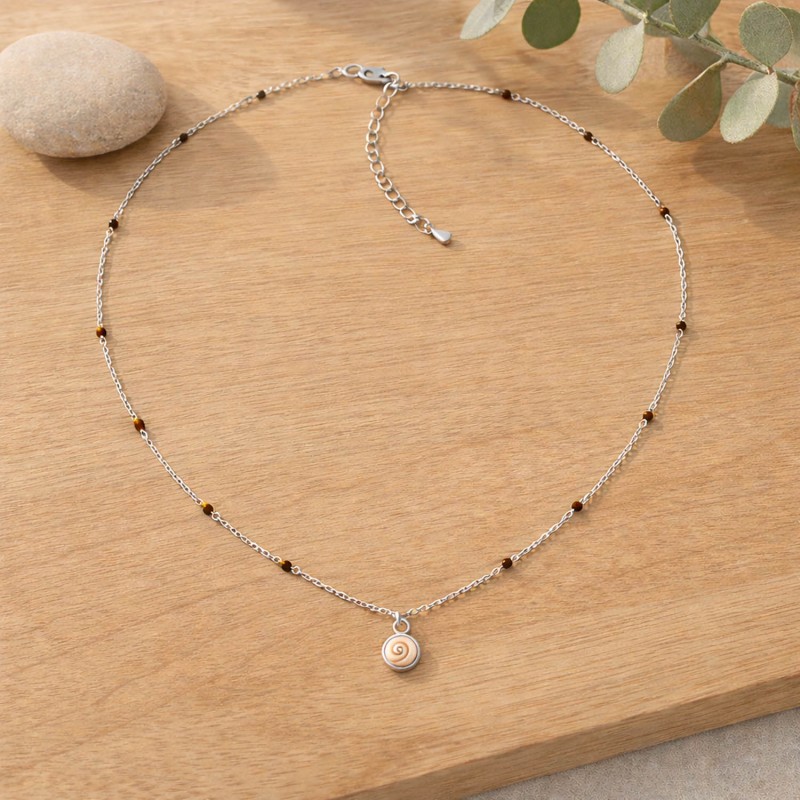 Collier argent orné d'un oeil de sainte Lucie Méditerranéen, accompagné de perles en pierre "œil du tigre" incrustées dans la chaine.