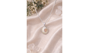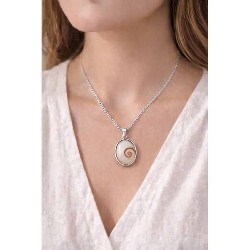 Épuré et intemporel, ce pendentif ovale met en scène un véritable œil de Sainte Lucie aux nuances blanc orangé et à la spirale marron/orange — comme une trace de lumière posée sur la peau. Son design classique, rehaussé par une finition brillante, s’accorde naturellement à toutes vos envies, du quotidien aux moments plus précieux.