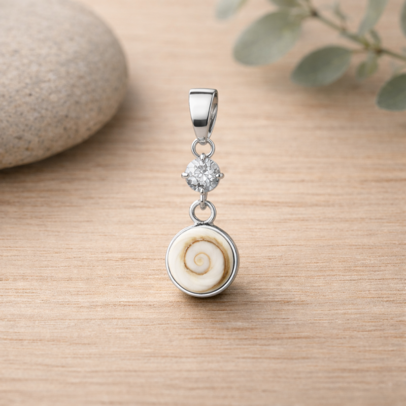Pendentif en argent 92.5 avec un œil de sainte Lucie du pacifique et un strass.