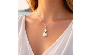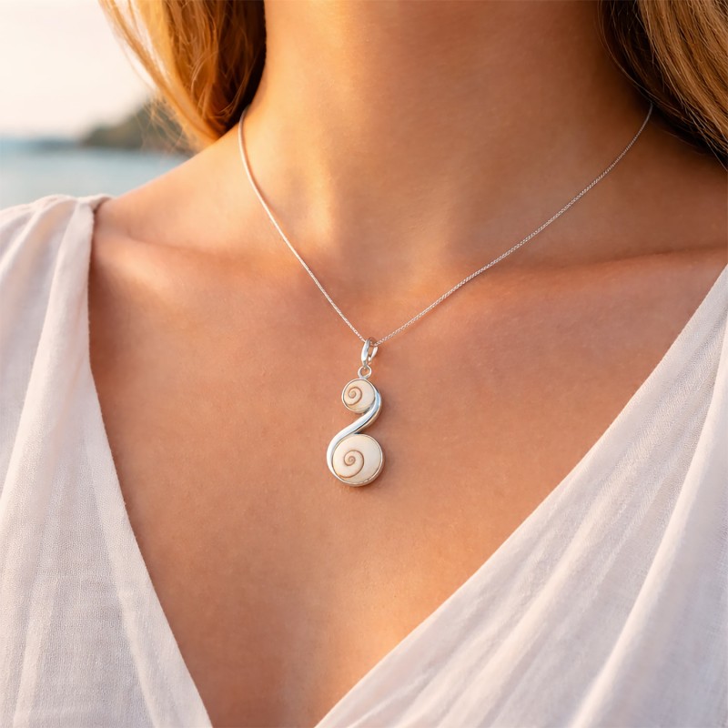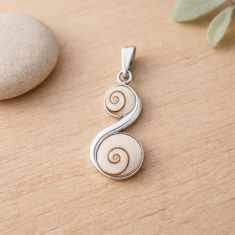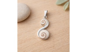 Inspiré de la collection Océane, ce pendentif en argent 925 dessine une élégante courbe et met en scène deux yeux de Sainte Lucie : l’un plus généreux, l’autre plus discret, comme un écho. La nacre blanche et sa spirale brun-orangé accrochent la lumière avec douceur, pour un bijou féminin, facile à porter au quotidien comme en soirée.