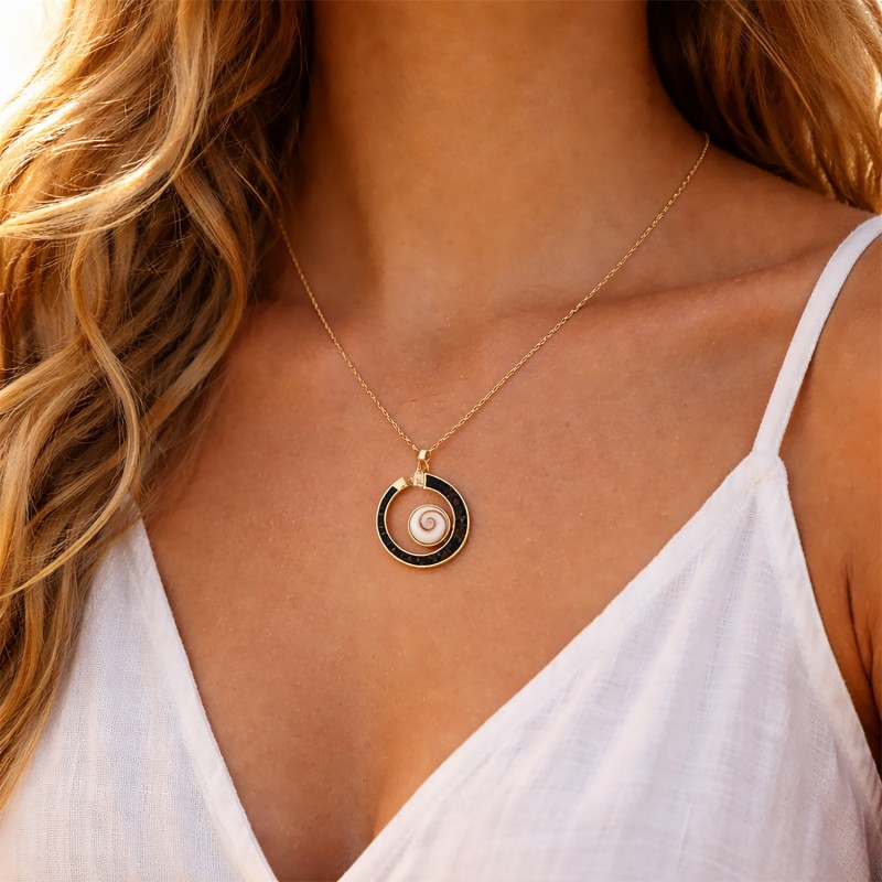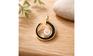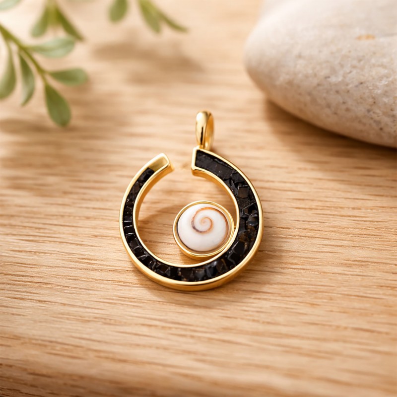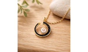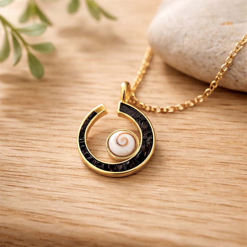 Équilibre parfait entre douceur et caractère : ce collier doré à l’or fin met en scène un véritable Œil de Sainte Lucie niché au cœur d’une demi-lune d’onyx noir, ponctué d’éclats d’onyx qui rythment la chaîne comme une constellation minérale. Une pièce à la présence subtile, pensée pour illuminer le décolleté au quotidien comme lors des moments précieux.