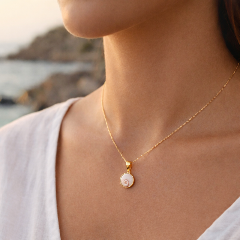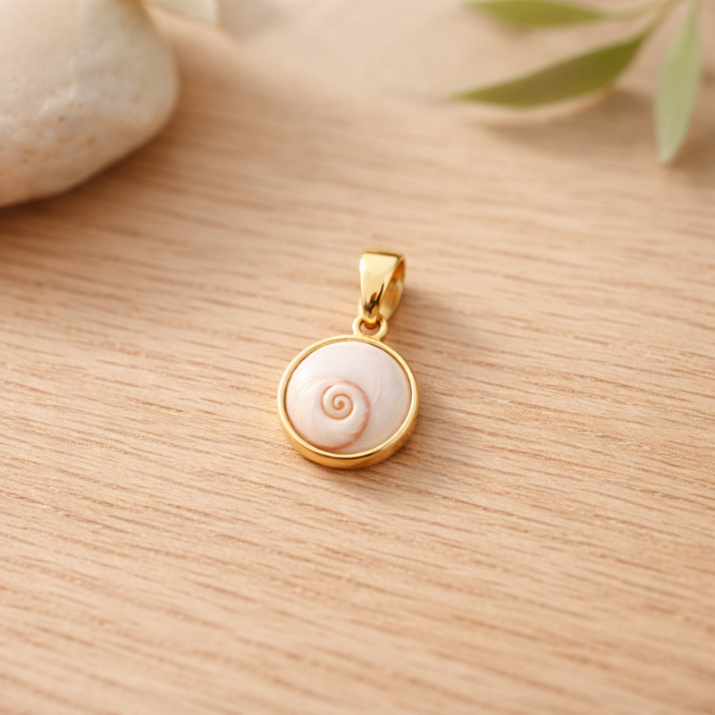 Avec sa spirale naturellement dessinée, ce pendentif Œil de Sainte-Lucie capte la lumière avec délicatesse et évoque ces instants où la mer semble déposer un secret sur le rivage. Monté sur laiton doré à l'or fin et sublimé par un serti fin à la finition brillante, il se porte comme un signe discret, élégant et rassurant.