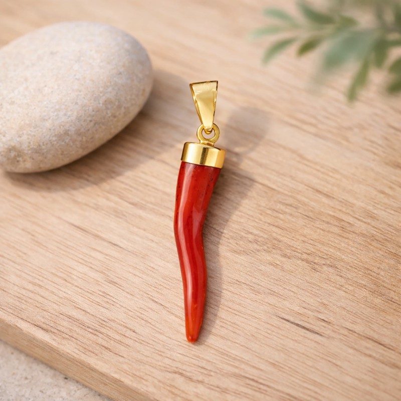 Un talisman puissant : ce pendentif corne en corail rouge et métal doré apporte protection, chance et énergie positive au quotidien.